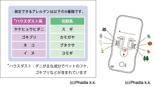 スギ(1~5月)、ヒノキ(3~5月)、カモガヤ(5~7月)、ブタクサ(8~10月)、ハウスダスト、ダニ、カビ、動物上皮 等