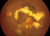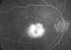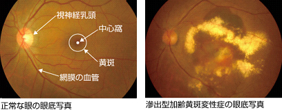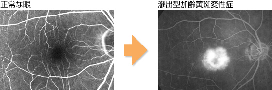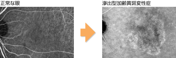 脈絡膜(みゃくらくまく)から異常な血管(脈絡膜新生血管(しんせいけっかん))が生えてくることによって起こるタイプです。新生血管は破れやすいため、出血したり、血液中の成分がもれ出して、黄斑が腫れ、ものを見る細胞の機能が障害されます。病状の進行が速く、急激に視力が低下していきます。 ルセンティスは滲出型の治療に用いられます。