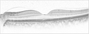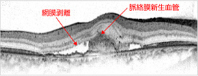 - 光干渉断層計を用いて、眼底組織の断面の状態を詳しく調べます。光干渉断層計は、網膜の断面を描き出します。滲出型加齢黄斑変性では、網膜剥離(はくり)(網膜が浮き上がっているところ)や網膜のむくみ、脈絡膜新生血管などが観察できます。